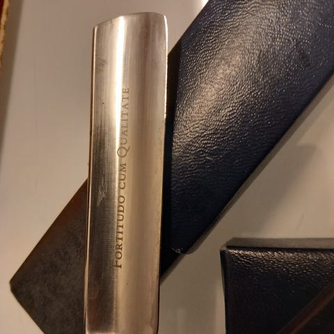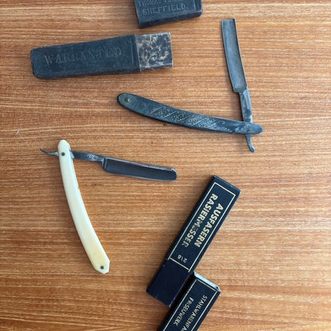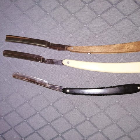 Barberkniv, Stål, 100 år gl., Gammel men stadig skarp og brugbar. Fra Puma solingen Zwilling barberkniv med celluloid- eller bakelitskæfte. 24cm lang.