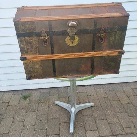 Vintage rejsekuffert / kiste i træ og metal / antik trunk