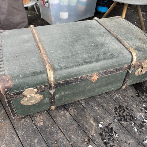 Vintage rejsekuffert / kiste i træ og metal. Kufferten har mørkgrønne sider med træremme og metalbeslag samt læderhåndtag og remme. Alt læder er intakt, hvilket er sjældent på disse streamer trunks. Indvendigt er den lys med indsatsbakke opdelt i rum. Egnet til opbevaring eller som dekorativt møbel. Jeg har brugt dem som konsolbord i min entre og tidligere som sidebord ved min sofa. Der ses originale rejsemærkater på siden med blandt andet teksten "Copenhagen". Nøglen er gået tabt. Den er 58 cm høj, 50 cm bred og 87 cm lang.