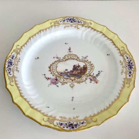 Porcelæn opsats med blå dekoration. Skålen står på fod og har rund form med svagt riflede sider. Både skål og fod er dekoreret med klassisk blåt mønster på hvid bund. Egnet til servering af frugt, kager eller som dekorativt element i indretningen.
