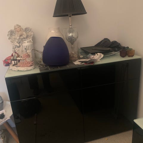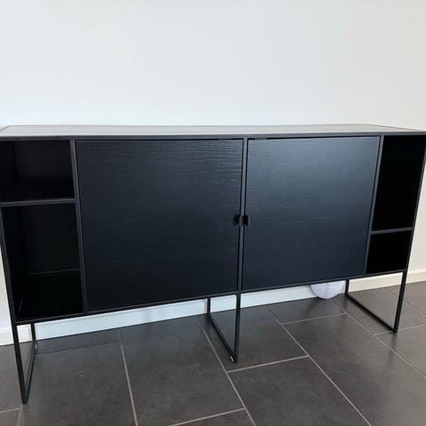 Sort Voice skænk i piano lak med tre låger og indvendige glas hylder. Skænken har glat, blank overflade og et enkelt, moderne udtryk. Velegnet til opbevaring i stue, spisestue eller entré, hvor der er behov for skjult opbevaring og en plan overflade til dekorationer eller belysning. Skænken har mørk glasplade monteret. Nypris 14.800,- købt hos Trend Bazaar.