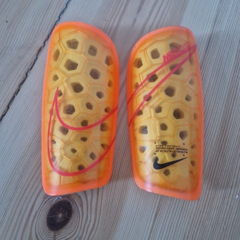 Nike Mercurial Lite benskinner i sort. Sættet består af lette, hårde skaller med perforeret bagside samt tilhørende sorte strømper/ærmer til at holde benskinnerne på plads.