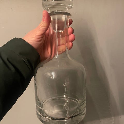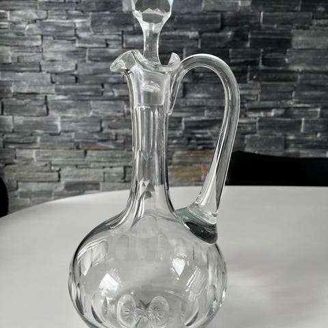 2 Glas karafler i klar glas med slebet, geometrisk mønster i glasset. Begge karaffeler har tilhørende glaspropper med matchende mønster. Ingen skår i hverken karafler eller propper.