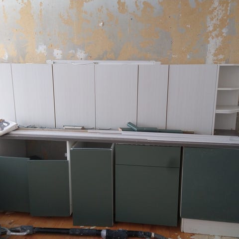 Uden køleskab og opvaskemaskine men med kogeplade og ovn.