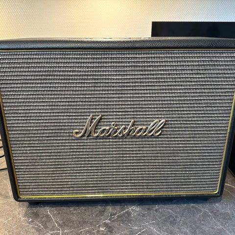 Marshall trådløs højttaler i sort kabinet med klassisk frontstof og Marshall-logo. Højttaleren har kontrolpanel på toppen med drejeknapper til volumen, bas og diskant samt tænd/sluk-knap. Velegnet som stationær højttaler til brug i stue, kontor eller værelse med mulighed for både trådløs og kablet tilslutning, afhængigt af model og tilgængelige porte.