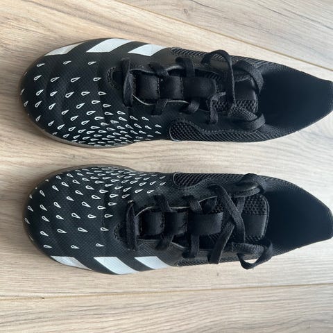 Adidas fodboldsko i størrelse 38. Skoene er i sort og gul med snørelukning og mønstret ydersål, egnet til indendørs fodbold eller andre glatte underlag. Overdelen har struktur for bedre boldkontrol, og sålen er flad med gummimønster for greb på gulv. Velegnet til fodboldtræning og kampe indendørs.