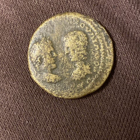 Mønt i metal med tydeligt slitage. Forsiden viser en krans rundt om midten af mønten med delvist læselig tekst langs kanten. Bagsiden har ligeledes tekst langs kanten og en figur eller motiv i midten, samt årstal nederst, som fremstår utydeligt på billederne. Mønten fremstår brugt og med patina. Velegnet til samlere af ældre eller uidentificerede mønter, hvor nærmere bestemmelse kan ske ved fysisk inspektion.