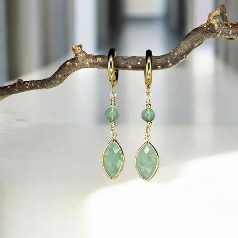 Smukke, unikke øreringe i naturens egne farver. Fluoritperler i forskellige størrelser giver et levende spil i lyset, og den håndformede spiral i guldfarvet wire gør dem både elegante og personlige.