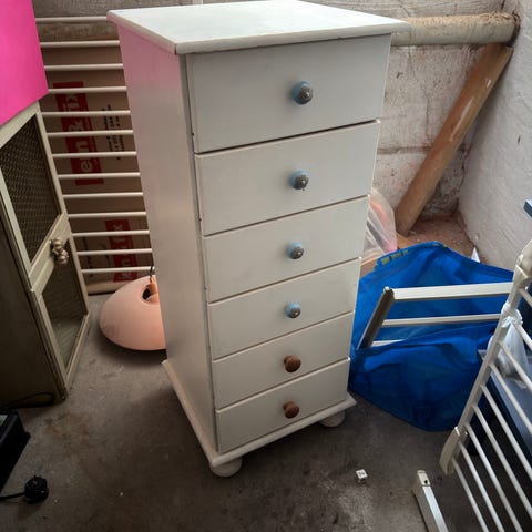 Skabet har en moderne design med lys træoverflade og en hvid ramme. Det indeholder både skuffer og skabe. Træsorten giver en naturlig og varm følelse. Håndtagene er diskrete i metal.,Afhentes i:,Røde Kors Kolding (621),Bemærk at mail, chat og beskeder ikke besvares, og varen skal købes på knappen "Gå til varen"