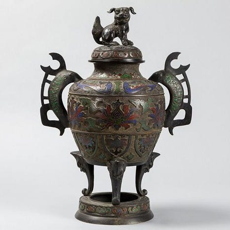 Håndklædeholder 手拭掛 fra sen Edo-periode Japan, lavet af lakeret træ med forgyldte kobberbeslag, aftageligt ramme med mon af ni bambusblade i cirkel, i gyldent hiramaki-e på sort lak, hviler på dobbelt-loddede bracket-fødder; dimensioner 58,3 cm høj, 66,4 cm bred, 23,7 cm dyb; god stand med mindre slid og lakafskalning langs kanterne; ægthedscertifikat medfølger. Klik på den blå "gå til varen" knap, for at købe eller byde på denne vare. Den samlede pris vil blive vist inden du afgiver dit bud.
