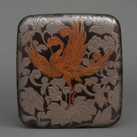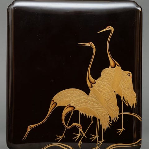 Original attribution; Japan; to-snitto af Taishō–Early Shōwa perioden to-snitto bord i towood writing board (文台, bundai) med guld, brun og rød hiramaki-e og takamaki-e, raden-inlays på en sort roiro‑urushi overflade, dimensioner 18,5 cm høj, 52,5 cm bred, 33,5 cm dyb, i god stand med let brugsspor; et certifikat for ægthed følger ved forsendelse. Klik på den blå "gå til varen" knap, for at købe eller byde på denne vare. Den samlede pris vil blive vist inden du afgiver dit bud.