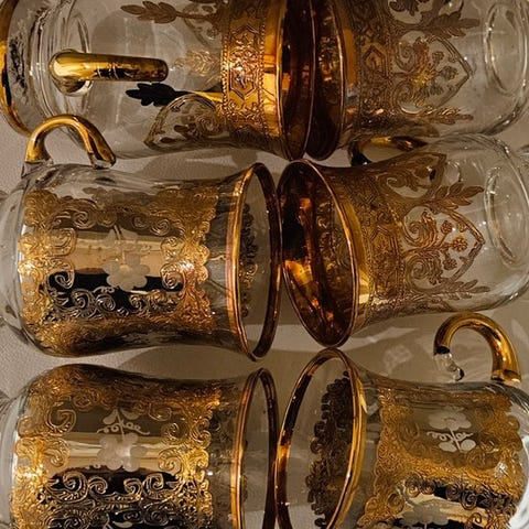 Sjældent får jeg lejlighed til at observere sådanne skønheder; i mine hænder er de glatte, skinnende, som kun ren Bohemian crystal kan være, alt beriget med rene gulddekorationer, der når perfektionen i teknikkerne og håndværket hos vores ekspert Murano-glaskunstnere. Indgraveret først med en pantograf og dernæst dekoreret med en pensel, vil disse glas fange opmærksomheden hos enhver, der ser på dem.