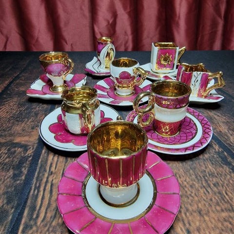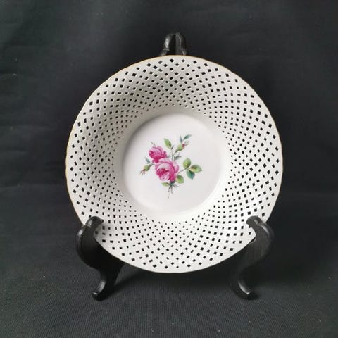Velkommen! Vi præsenterer kaffekopper med underkopper i kurv-mønster og blomster med sommerfugl fra KPM Berlin.