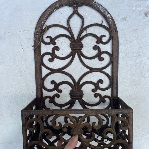 En hængeplantekasse af smedet jern i hvid/beige, højde 75 cm, bredde 32 cm og dybde 32 cm, oprindelse Belgien, estimeret periode 2020+, god brugt stand med små aldersrelaterede tegn, titel Bloemenmand - hangplanten. Klik på den blå "gå til varen" knap, for at købe eller byde på denne vare. Den samlede pris vil blive vist inden du afgiver dit bud.