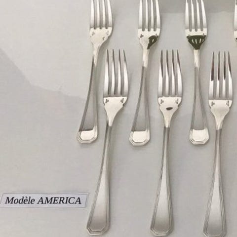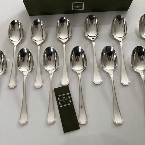 Bestikket er fra Christinox, et mærke af Christofle, med håndtag af mat børstet stål og polerede overflader.