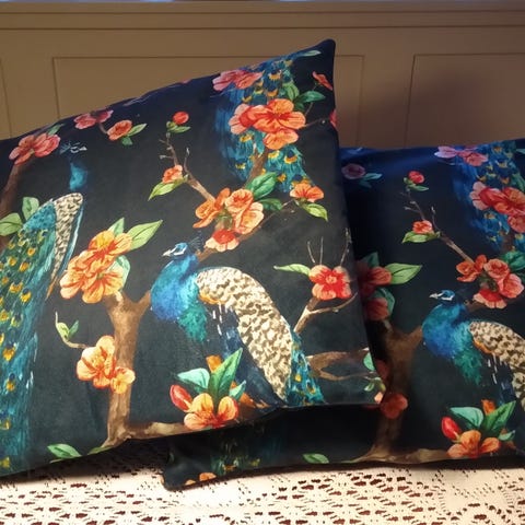 Fem dekorative puder i et sæt med Morris & Co stof 'Strawberry Thief', bomuld/mikrofiber-polyester, indlæg inkluderet, ny stand, oprindelse Storbritannien, målerne 42×42 cm, skønnet periode 2020+. Klik på den blå "gå til varen" knap, for at købe eller byde på denne vare. Den samlede pris vil blive vist inden du afgiver dit bud.