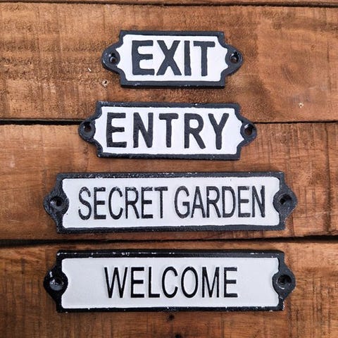 Håndmalede støbejernsskilte. Skiltet leveres med forudborrede huller til nem ophængning. Skiltet har sort hævet skrift på hvid baggrund. Dette design er populært til kontorer, pub’er, hoteller og haver.