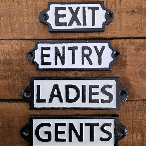 Håndmalet støbejerns-skiltesæt fra Polen, dateret 2000-2010, med forborrede huller til hængning og sorte hævede bogstaver på hvid baggrund, inklusive EXIT (H 5 cm x B 13 cm x D 0,4 cm, 0,25 kg), ENTRY (H 5 cm x B 16 cm x D 0,4 cm, 0,30 kg) og SECRET GARDEN/WELCOM (B 21,5 cm x H 5 cm x D 0,4 cm, 0,45 kg); stand: som ny. Klik på den blå "gå til varen" knap, for at købe eller byde på denne vare. Den samlede pris vil blive vist inden du afgiver dit bud.
