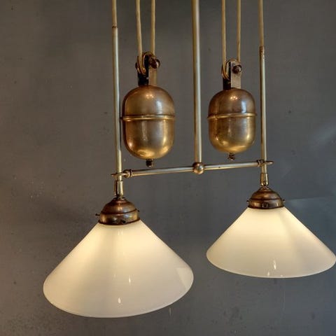 Messinghængelampe i biblioteksstil med to opaline glas skærme Ø30 cm, 120 cm høj, 100 cm bred, 30 cm dyb, to E27-få fittinger, model Bliotheeklamp – Opaline glas, oprindelse Nederlandene, periode 1970–1980, i god stand med mindre slid og i funktion. Klik på den blå "gå til varen" knap, for at købe eller byde på denne vare. Den samlede pris vil blive vist inden du afgiver dit bud.