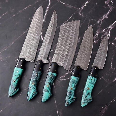 Smukt matchende sæt af fem håndlavede køkkenknive, fremstillet af mønstret Damascus-stål. Hvert blad viser et attraktivt lagdelt stål mønster, resultatet af traditionelle smedeteknikker. Sættet dækker et bredt udvalg af køkkenopgaver, fra tung hakning til fin skæring.