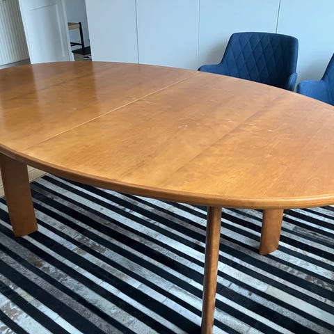 Bordet er i god stand med brugsspor i lakken. 90 cm bredt, 135 cm langt, 240 cm med begge tillægsplader og 75 cm højt.
