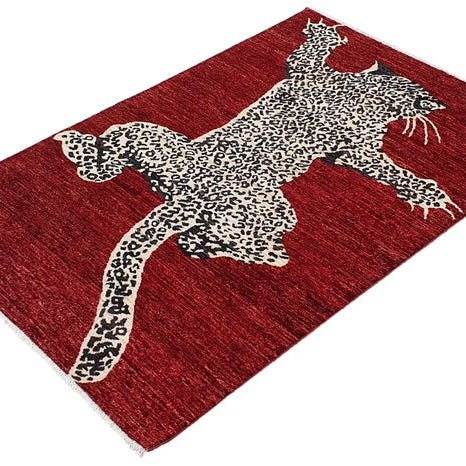 Moderne håndknyttede designerteppich fra Pakistan med markant tiger-motiv. Lysende rød-, creme- og sorttoner skaber en stærk, dekorativ effekt. Teppichen er af høj kvalitet og ideel som et særligt element i ethvert rum.