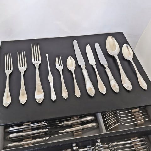 Meget smukt og usædvanligt omfattende Wiskemann-bestiksæt, fremstillet i Belgien og dateret fra mellemkrigstiden (ca. 1920–1940). Wiskemann er internationalt kendt for sine høj-kvalitets sølvbelagte bordvarer og nyder stor interesse hos samlere.