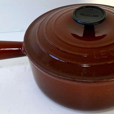 Elegant vintage støbejernsgryde med emalje fra Le Creuset, i sin sjældne og ikoniske terracotta-farve, kendetegnende for husets historiske produktioner. Den lyse emaljerede inderside giver en raffineret kontrast, samtidig med at den sikrer fremragende varmefordeling og varmebevarelse.