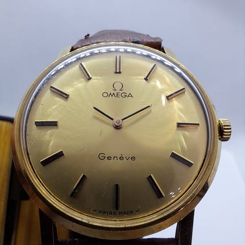 Omega vintage håndoptrukket ur, reference 7503-16, stålcase 34 mm, champagne-læder, læderrem, herre, tidligt i 1960’erne, i god stand med synlige brugsspor. Klik på den blå "gå til varen" knap, for at købe eller byde på denne vare. Den samlede pris vil blive vist inden du afgiver dit bud.