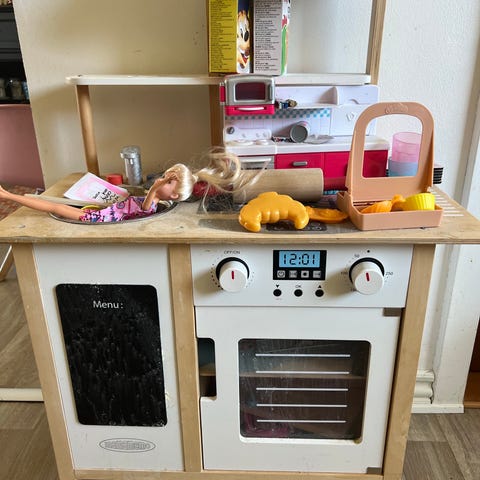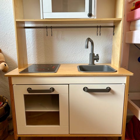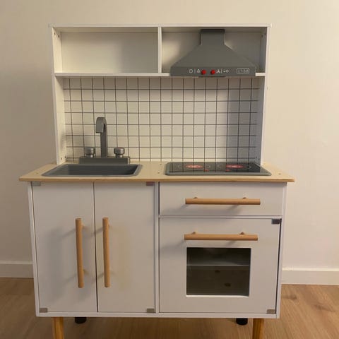Vores piger er blevet for store og får ikke leget med dette mere, men der en mange timers leg tilbage i køkken, det indeholder det meste men der kan supleres med ting. Og ja nogen træting har småskrammer, og nogen papting er brugt, men til denne pris kan det smides ud, men det lader jeg være op til jer. Mamamemo elementer kan tages ud da de ikke er fast monteret men det fungere rigtig fint i denne og der er monteret lys. Mål fremgår af billede. Det er ikke malet hvidt på bagsiden, da det mest har stået op af væg, men vi har også haft det som rumdeler så det kan det også bruges som. (Kan ikke vælge Mamamemo, derfor ikea da de har børne køkken)