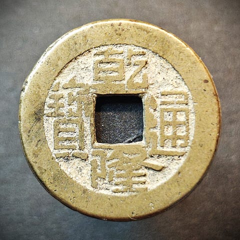 K8) "BOO CIOWAN" (Beijing mønt), Type H3 (Shanlong): 缶 radical i stedet for 生 radical i 隆; horisontale dots i 辶 radical i 通,, fremstikkende top på Boo, radical マ in 通, Hartill# 22.242, Schjöth 1463