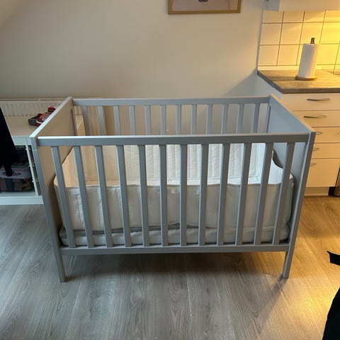 IKEA tremmeseng i hvid. Klassisk tremmeseng med lameller på siderne og lukkede gavle. Sengen kan bruges som babyseng og kan ombygges til juniorseng ved at fjerne den ene side eller montere sengehest, som vist på billederne. Velegnet til spædbørn og småbørn. Materiale er malet træ/finér i hvid farve. Madrassen, topmadsessen, lagen, sengehest medfølger. Det er den gode madras der er købt til sengen.
