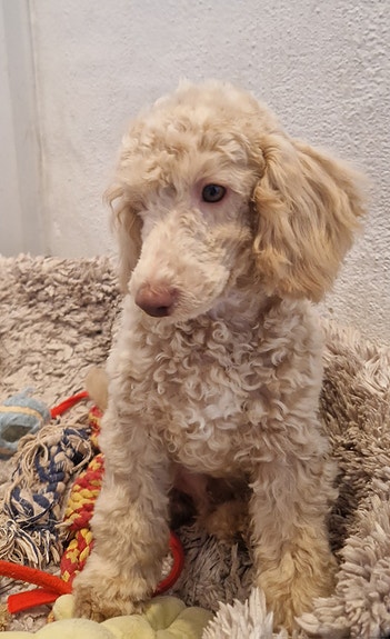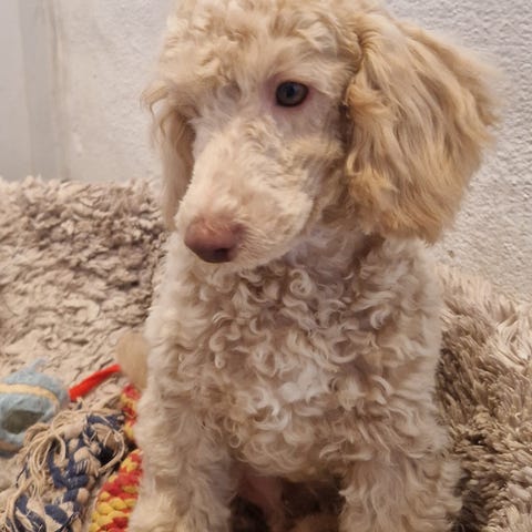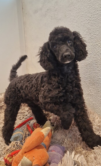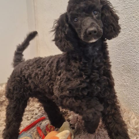 Pudlen er allergi venlig og fælder ikke. En familie hund som er god som dagen er lang.