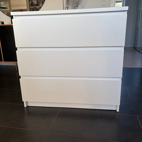 IKEA Malm kommode med 4 skuffer i hvid. Kommoden har en bredde på 80 cm, dybde på 48 cm og højde på 100 cm. Hver skuffe har en indvendig bredde på ca. 72 cm og indvendig dybde på ca. 43 cm. Kommoden er velegnet til opbevaring af tøj, tekstiler eller andre genstande i soveværelse, entré eller stue. Overfladen kan bruges til fx lamper eller mindre genstande. Neutralt, enkelt design der passer ind i mange rum.