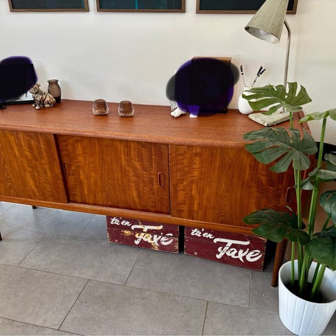 Teaktræ skænk i pæn stand. Fire skydelåger. Tre skuffer. Runde tilspidsede ben.