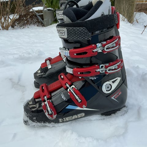Head Vector 110 skistøvler i sort med røde og grå detaljer i størrelse 26,5 (mondo). Støvlerne har fire justerbare spænder og powerstrap øverst for bedre støtte om underbenet. På skallen fremgår bl.a. High Top Tech, Duo Flex, Smart Frame og Evo Balance, som er designet til effektiv kraftoverførsel og stabilitet. Flexen er angivet til 90–90, og læsten er 102 mm, hvilket giver en relativt komfortabel pasform. Velegnet til alpinski på pister. Undersålerne er udstyret med udskiftelige sålindsatser for bedre greb ved gang på hårdt underlag.