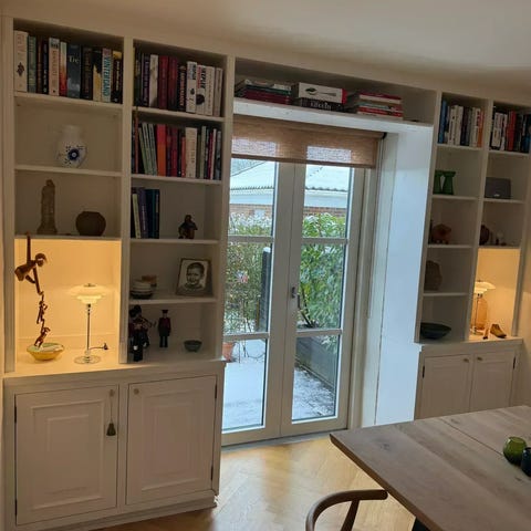 Vi kommer ud og måler op så målene bliver rigtige. Også vitrineskabe.