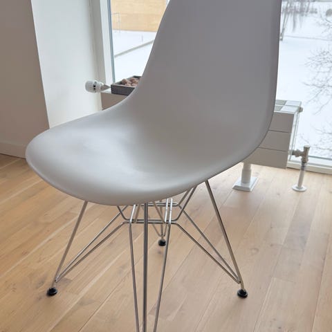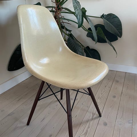 Tre Eames spisestole i glasfiber til salg. To grønne og en lysebrun. Den lysebrune har en sort pude monteret.