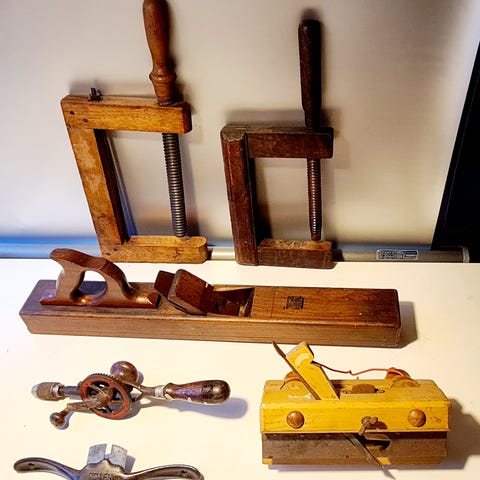 Snedkerværktøj. Høvl og håndværktøj, 100 år gl., Høvl og måleværktøj og dorn-lignende værktøj samt barber-knive.