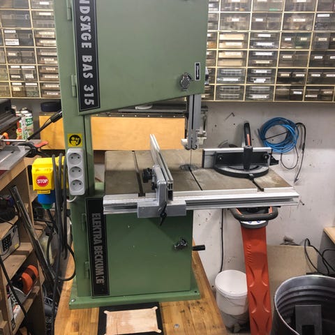 Elektra Beckum BAS 315 båndsav i grøn farve. Savbord i metal med justerbar føring og sikkerhedsafbryder på fronten. Maskinen står på fritstående stativ, som giver stabilitet under brug. Velegnet til træbearbejdning og andre opgaver, hvor der er behov for præcise lige og kurvede snit,