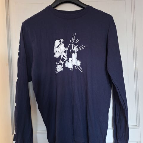 Langærmet, mørkeblå T-shirt med et hvidt tryk af Anders And på forsiden. På det ene ærme er der trykt forskellige Anders And figurer, og på det andet ærme er der trykt symboler.