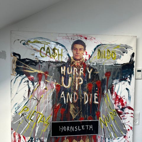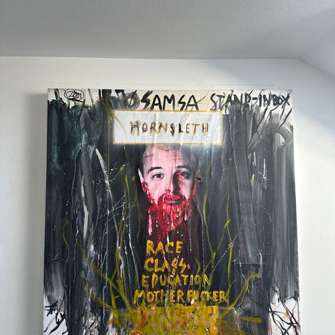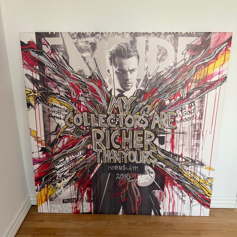 Trykt 90 x 90 cmHornsleth Deep Storage maleri. Kunstværket fremstår som et farverigt, ekspressivt motiv med tekst og figurative elementer i blandede teknikker på lærred. Velegnet som vægkunst i stue, kontor eller galleri. Årstal 2008 fremgår på værket.