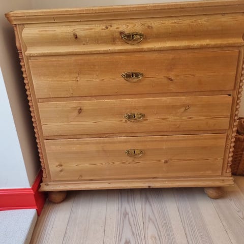 Flot gammel kommode i fyrretræ med flot patina. Fodlisten på venstre side mangler (sidste billede), men det ses ikke forfra, så hvis den står op af en væg mod siden som på billederne ses det ikke. En liste på nederste skuffe sidder løs, men har ingen funktionsbetydning. Kan limes. Skufferne glider perfekt