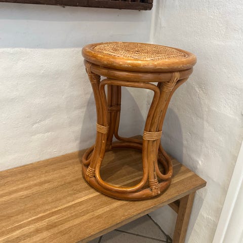 Skammel med polstret sæde i mønstret stof i røde og beige nuancer. Skamlen har mørke træben med drejede detaljer. Velegnet som ekstra siddeplads eller som fodskammel i stue, soveværelse eller entré.