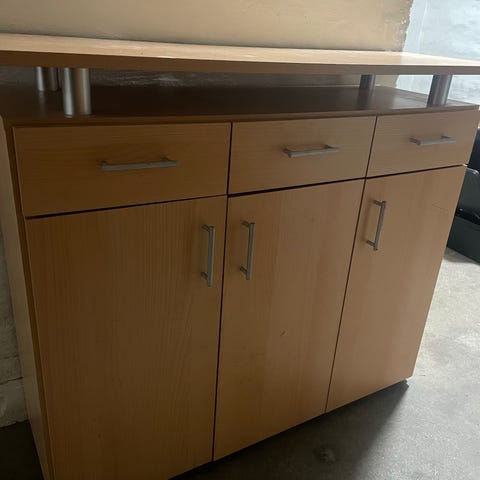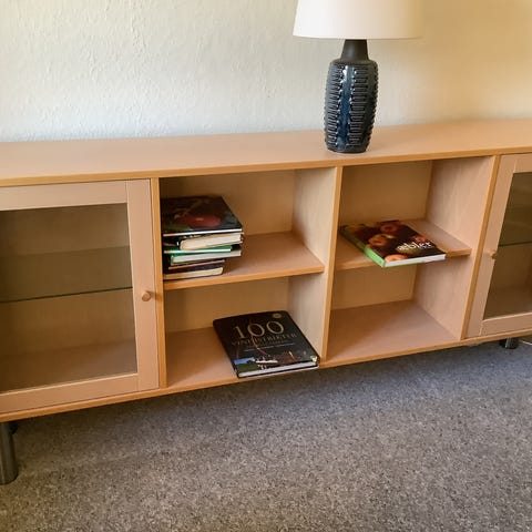 Flot reol/skænk i træ med låg i den ene side.