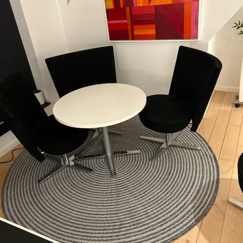 Bordsæt bestående af et rundt bord, et rektangulært bord og en stol. Begge borde har bordplade i lyst træ og understel i metal. Det runde bord har søjlefod i grå metal, mens det rektangulære bord har fire ben i sølvfarvet metal. Stolen har rund sædeplade og ryglæn i lys, neutral farve samt ben i mørkt metal. Sættet kan anvendes i køkken, spisestue eller mødelokale. der er flere borde og stole, prisen er ikke fast