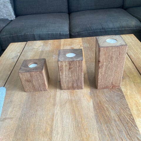 Sæt med tre fyrfadsstager i træ i brun nuance. Stagerne har en geometrisk, sekskantet form og er beregnet til standard fyrfadslys. Hver stage står på en lille træfod, som giver stabilitet på bord eller hylde. Velegnet som enkel borddekoration eller til brug i stue, køkken eller andre opholdsrum.