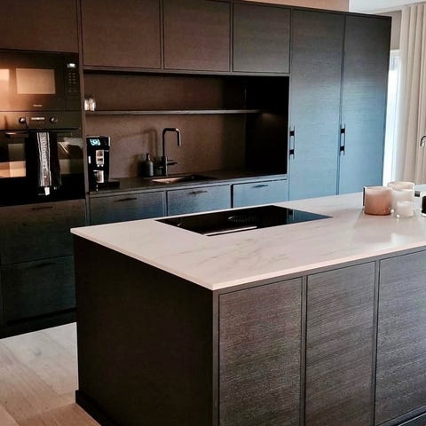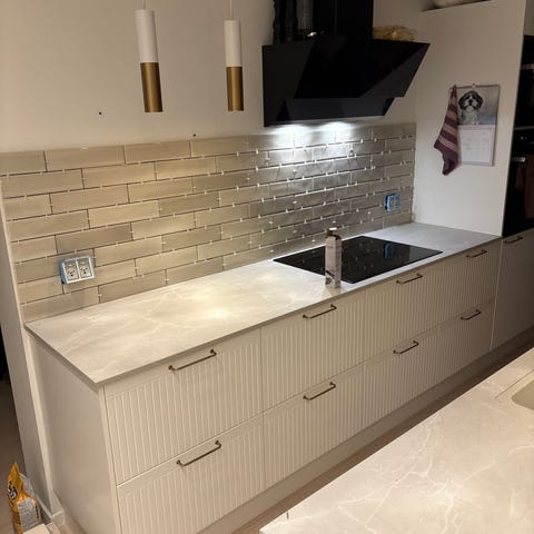Køkkenbordplade stenplade i lys beige nuance med naturlig åretegning.hvor der ønskes en stenplade med marmormønster.