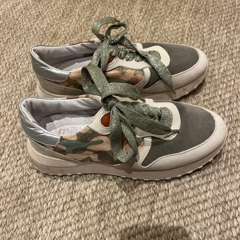 Hvid og beige ruskind med sølvfarvede detaljer.