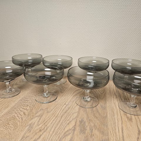 Sæt med fem elegante champagneglas fra Holmegaards klassiske Atlantic-serie, designet af Per Lütken. Glassene har den karakteristiske røgfarvede kumme og klare stilk – et smukt og tidløst design fra 1960’erne, der passer perfekt til både festlige lejligheder og en veldækket hverdagsbord.